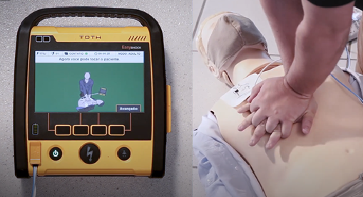 Depois que parada cardiorrespiratória for identificada e o SAMU acionado, deve-se iniciar o socorro com compressões toráxicas e o uso do DEA Easyshock.
